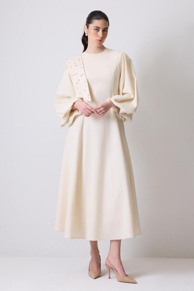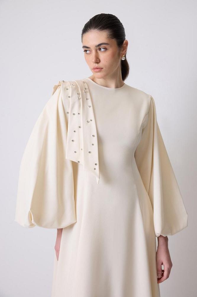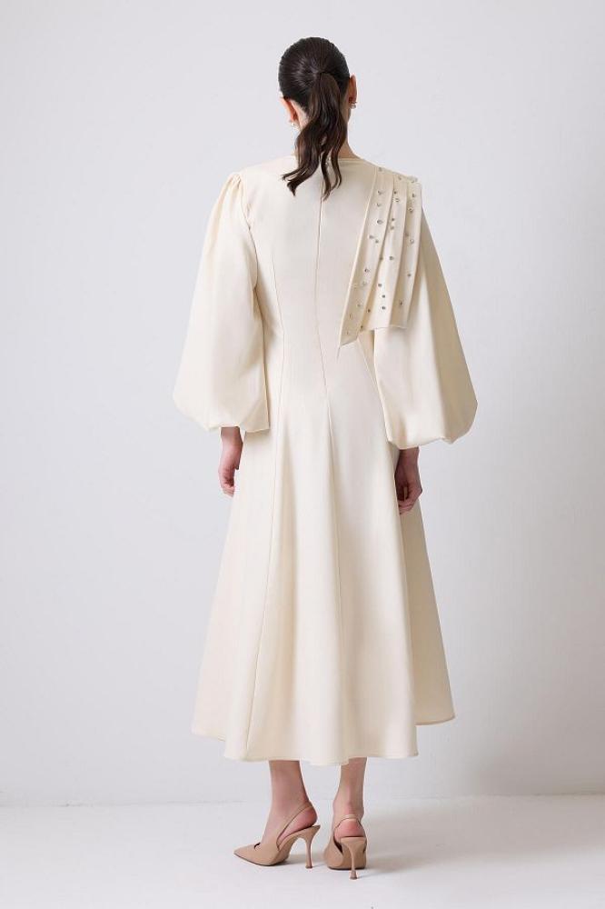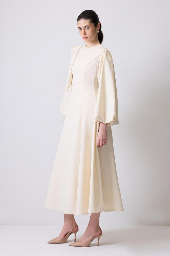 فساتين بلون البيج مطرز بأكمام منفوخة بلون بيج أنيق يجمع بين الفخامة والتصميم العصري، مناسب للمناسبات الخاصة ويبرز جمال المرأة مع خامة عالية الجودة تضيف لمسة مميزة لإطلالتك من متجر stylna-sa.
